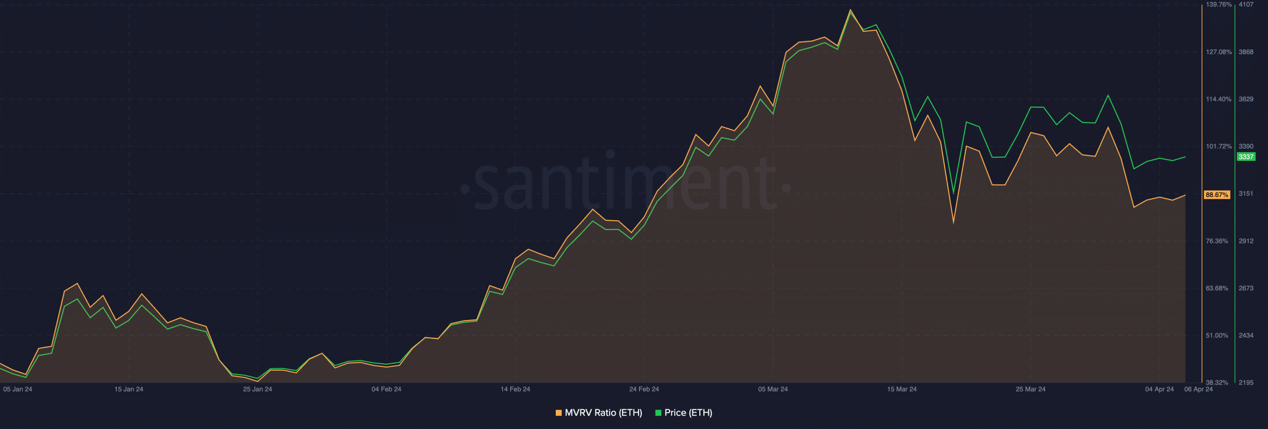 Скокът на цената на ETH над $3,500 през първото тримесечие докара и до скок на съотношението на пазарната стойност към осъществената стойност (MVRV) – индикатор, употребен за оценка дали даден актив е надценен или недооценен. MVRV съотношението на ETH доближи най-високата си стойност от началото на годината – 138.38%, когато цената му се увеличи до $4,000 на 11 март.