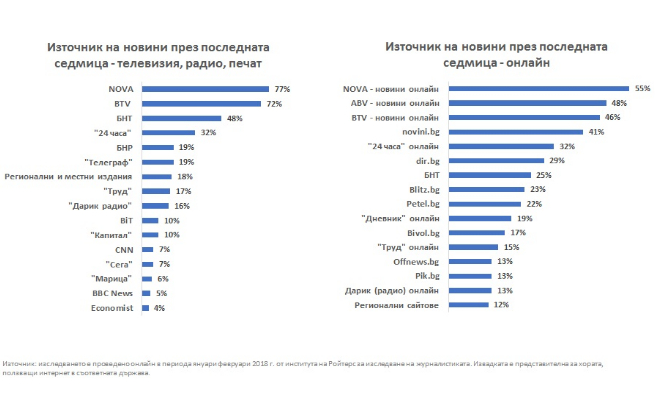 *Източник: Национално представително изследване на GfK, извършено в интервала 3-23 май 2018 измежду респонденти на възраст 18-49 година, по поръчка на Нова Броудкастинг Груп; Reuters Institute for the Study of Journalism / Digital News Report 2018.