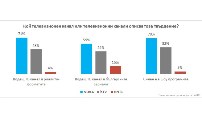36% от респондентите са на мнение, че „ NOVA е най-често гледаният ТВ канал” и се откроява като малкия екран, на която 46% от участвалите в изследването биха се доверили в най-голяма степен, с цел да бъдат осведомени по време на трагични събития, засягащи цялото общество. За към 45% от участвалите в изследването NOVA е водещият ефирен канал в България, следван от bTV с 38%.