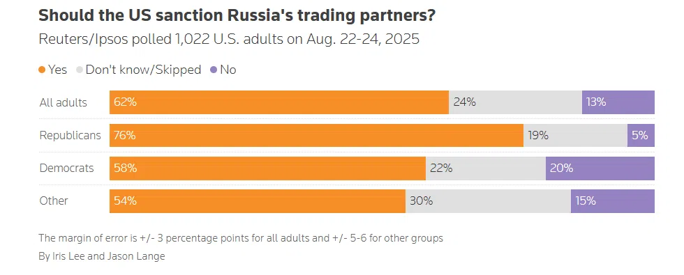 Около 76% от републиканците в анкетата на Reuters/Ipsos поддържат глобите против съветските търговски сътрудници като метод да се спре войната, както и болшинство от 58% от демократите.