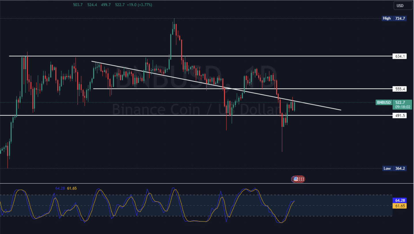Според някои крипто запалянковци Binance Coin (BNB) демонстрира признаци на бичи подтик, защото тества основно равнище на поддръжка при $491.