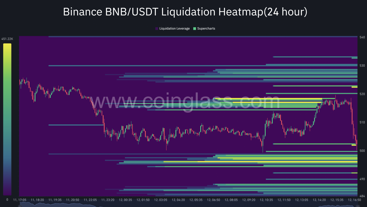 Според данните на Coinglass има забележителен ликвидационен пул, съдържащ 37,200. броя BNB на цена от към $522.