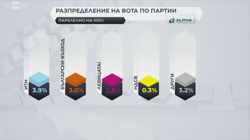 Под чертата остават Има Такъв Народ (3.9%), " Български напредък " (3.0%), " Левицата " (2.3%) и Национална движение „Симеон Втори" (0.3%)