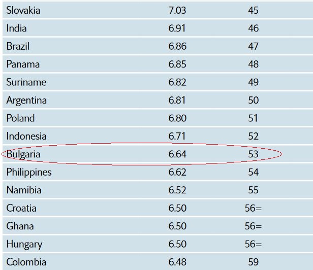 Известно е, че топ 7 на листата попадат: Норвегия (9,75 точки), Нова Зеландия (9,37 точки), Финландия (9,27 точки), Швеция (9,26 точки), Исландия (9,18 ), Дания (9,09) и Ирландия (9).