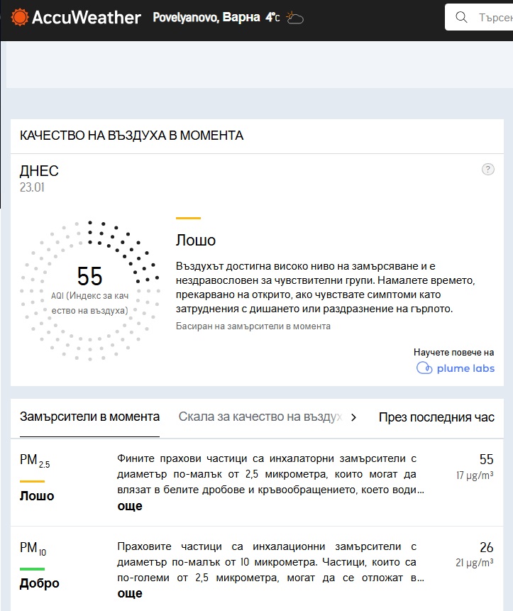 Въздухът доближи високо равнище на замърсяване и е вреден за чувствителни групи. Намалете времето, прекарвано навън, в случай че чувствате признаци като усложнения с дишането или неспокойствие на гърлото, сочи системата.