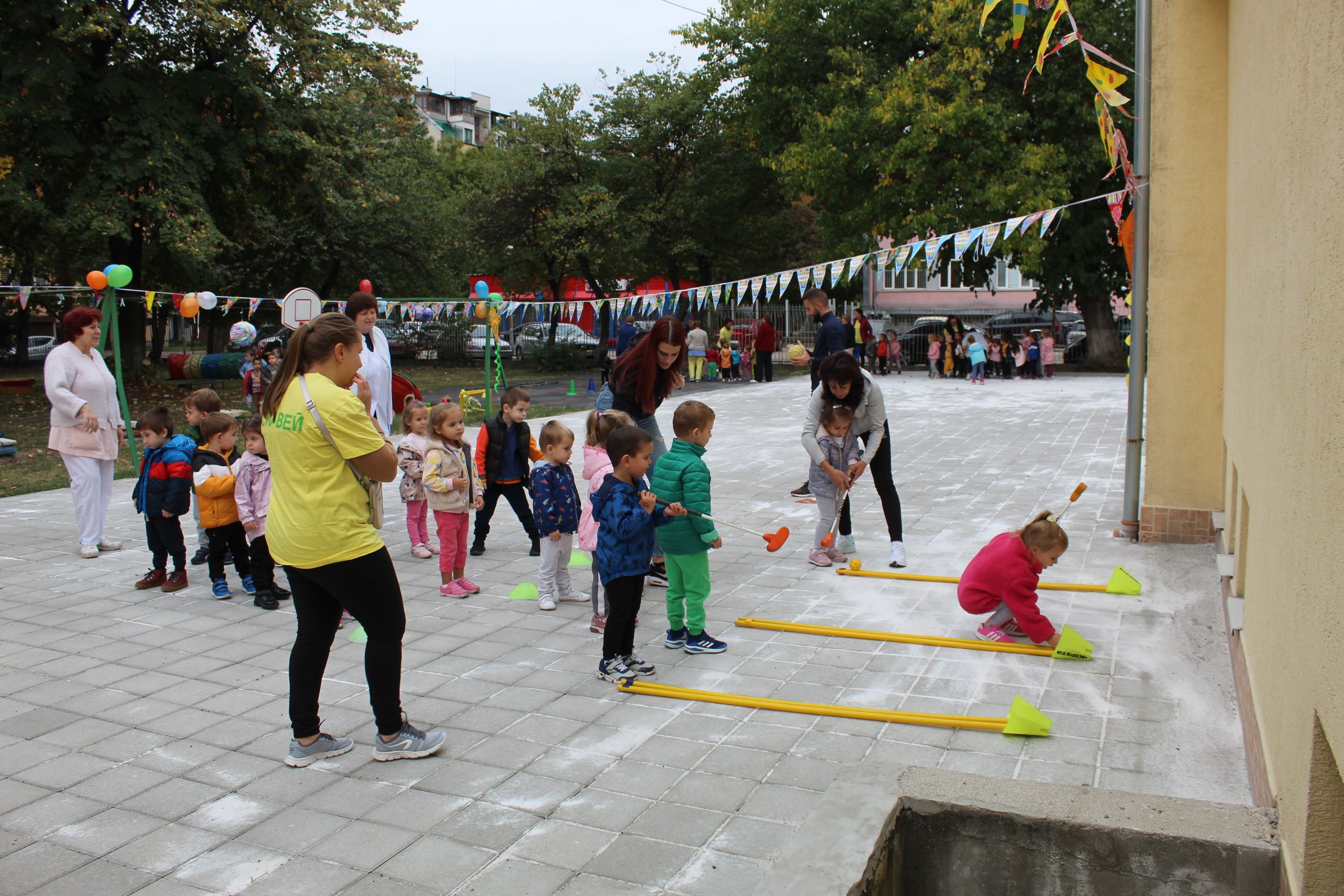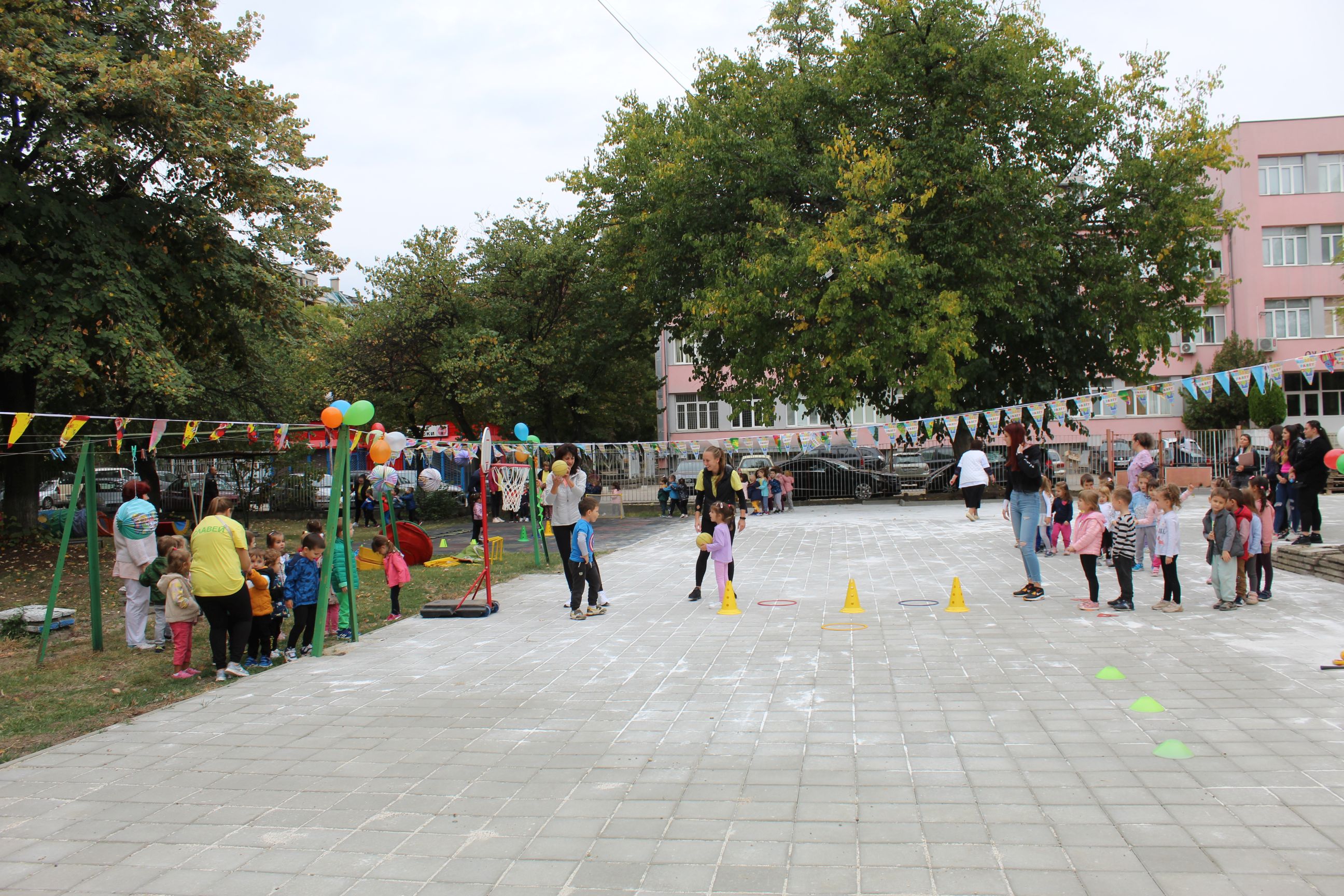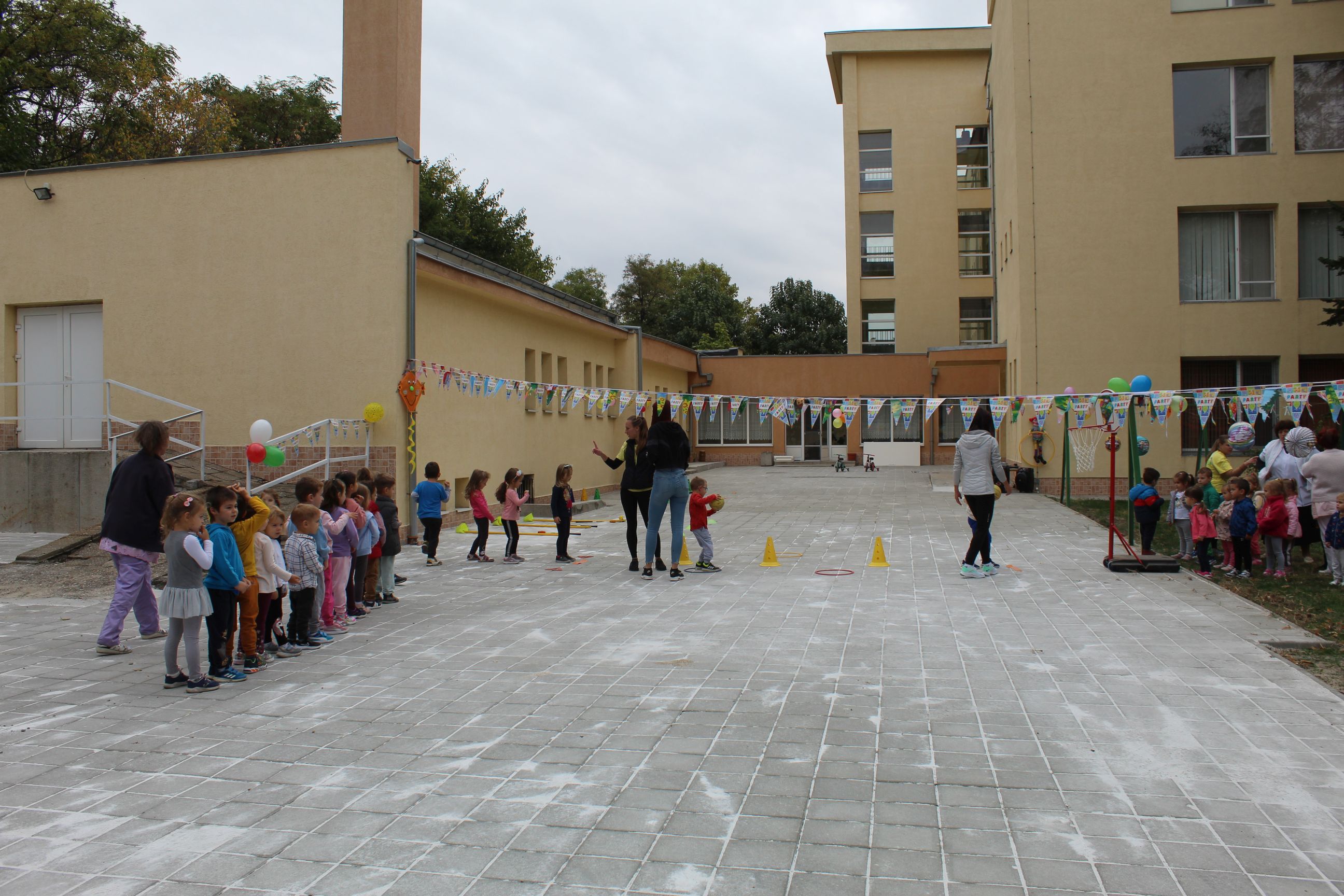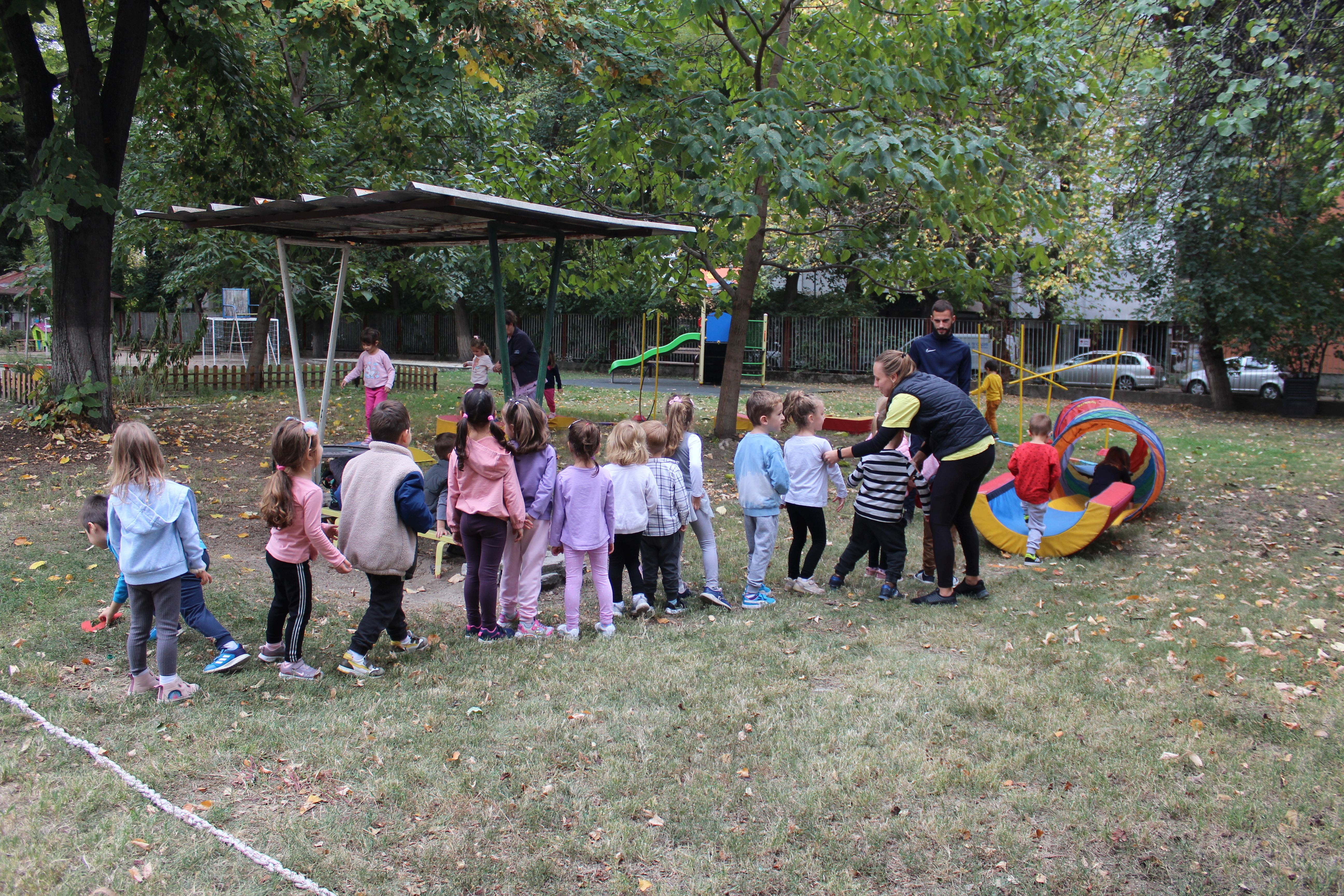 Спортните уреди бяха ситуирани във вътрешния двор на детската градина върху реновираната настилка.Малчуганите се упражняваха в детайли на разнообразни типове спорт-хандбал, волейбол, баскетбол, бадминтон и футбол.Освен това взеха присъединяване и в спортни действия като провиране, лазене, скачане и вървене в зиг-заг.