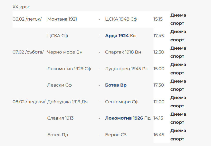 Монтана и ЦСКА 1948 ще открият шампионата с мач на 6 февруари, петък, от 15:15 часа на „ Огоста “. По-късно денем ЦСКА приема Арда на „ Васил Левски “.