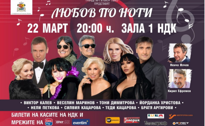 Любими български звезди се събират в спектакъла "Любов по ноти " на 22 март от 20:00 часа в Зала 1 на НДК. Виктор Калев, Веселин Маринов, Йорданка Христова, Тони Димитрова, Силвия Кацарова, Ненчо Илчев, Братя Аргирови, Нели Петкова, Теди Кацарова, Кирил Ефремов и гост-изненади, сплотяват гений в това незабравимо шоу. Билети.