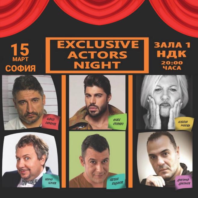 Звезден актьорски състав и именити музиканти и артисти ви чакат в комедийния концерт-спектакъл "Еxclusive Actors Night " на 15 Март , в Зала 1 на НДК. Участие ще вземат едни от най-актуалните и обичани български актьори - Аня Пенчева, Мария Сапунджиева, Александър Кадиев, Кирил Ефремов, Руслан Мъйнов, Ненчо Илчев, Павел Иванов, Албена Михова, Евгени Будинов и специфичната гост-звезда неповтормият Мариус Куркински . Билети.