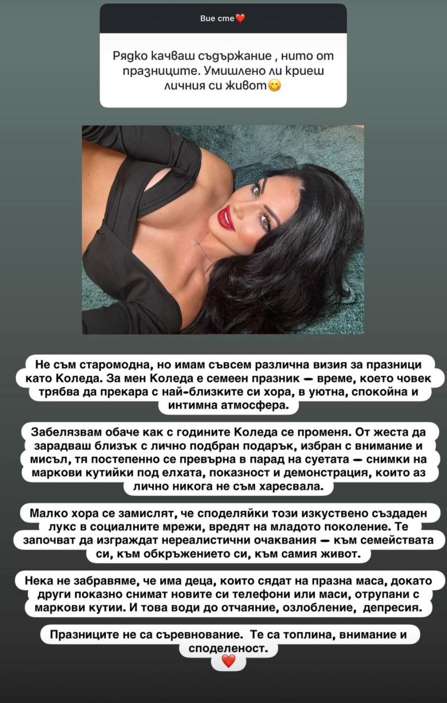Според пловдивската хубавица, до момента в който известни персони парадират с маркови, безумно скъпи дарове и отрупани до безсрамие трапези, други даже нямат какво да сложат на масата си за Коледа.