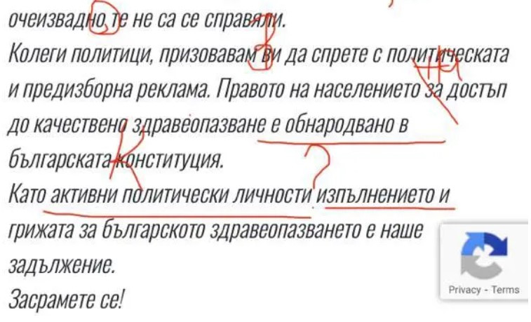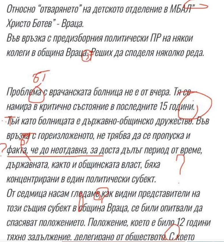 От несвързаните послания разбираме само, че някой би трябвало да се засрами и че този някой не е актуалният министър на опазването на здравето Хинков, който единствено три пъти и то за малко време съумя да излъже жителите на региона, че Министерство на здравеопазването ще се оправи с проблемите в МБАЛ „ Христо Ботев “-Враца, а след това упрекна общините, написа zovnews.