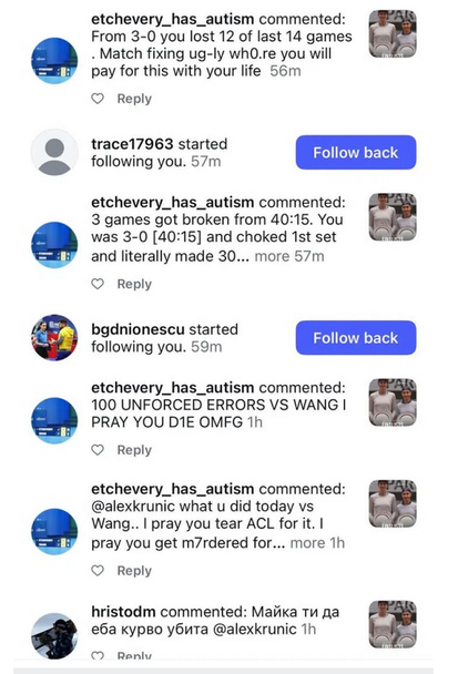 Сръбската тенисистка показа в Инстаграм извънредно неприятни известия. Едно от тях гласи: " От 3:0 загуби 12 от 14 гейма, нагласена мач, грозна ку*во, ще платиш с живота си за това “.