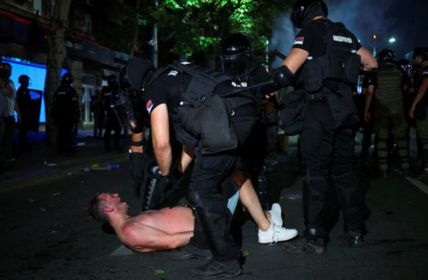 Протестиращите хвърляха бутилки, димки, сигнални ракети и камъни по служителите на реда, които им отвърнаха със сълзотворен газ по най-дългия бул. в сръбската столица „ Крал Александър “.