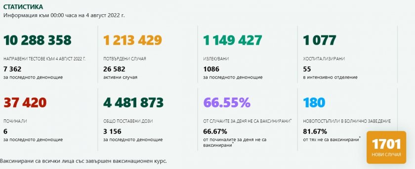 Пациентите, които са постъпили в интензивни отделения, са 4-ма. От тях единствено един е с ваксина. За последното денонощие са умряли 6 души.