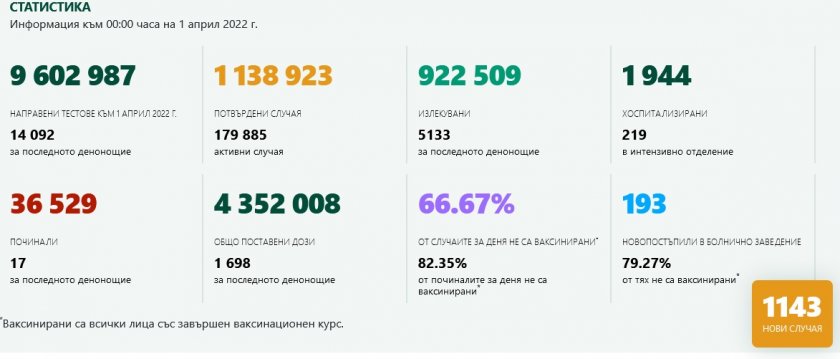 Сравнително скромните 1143-ма българи са инфектираните с ковид за последните 24 часа, с 33-ма по-малко от през вчерашния ден, сочат данните на Единния информативен портал. Починалите са 17 души, от които трима са със приключен имунизационен цикъл. За седмица смъртността е намаляла с 10%.