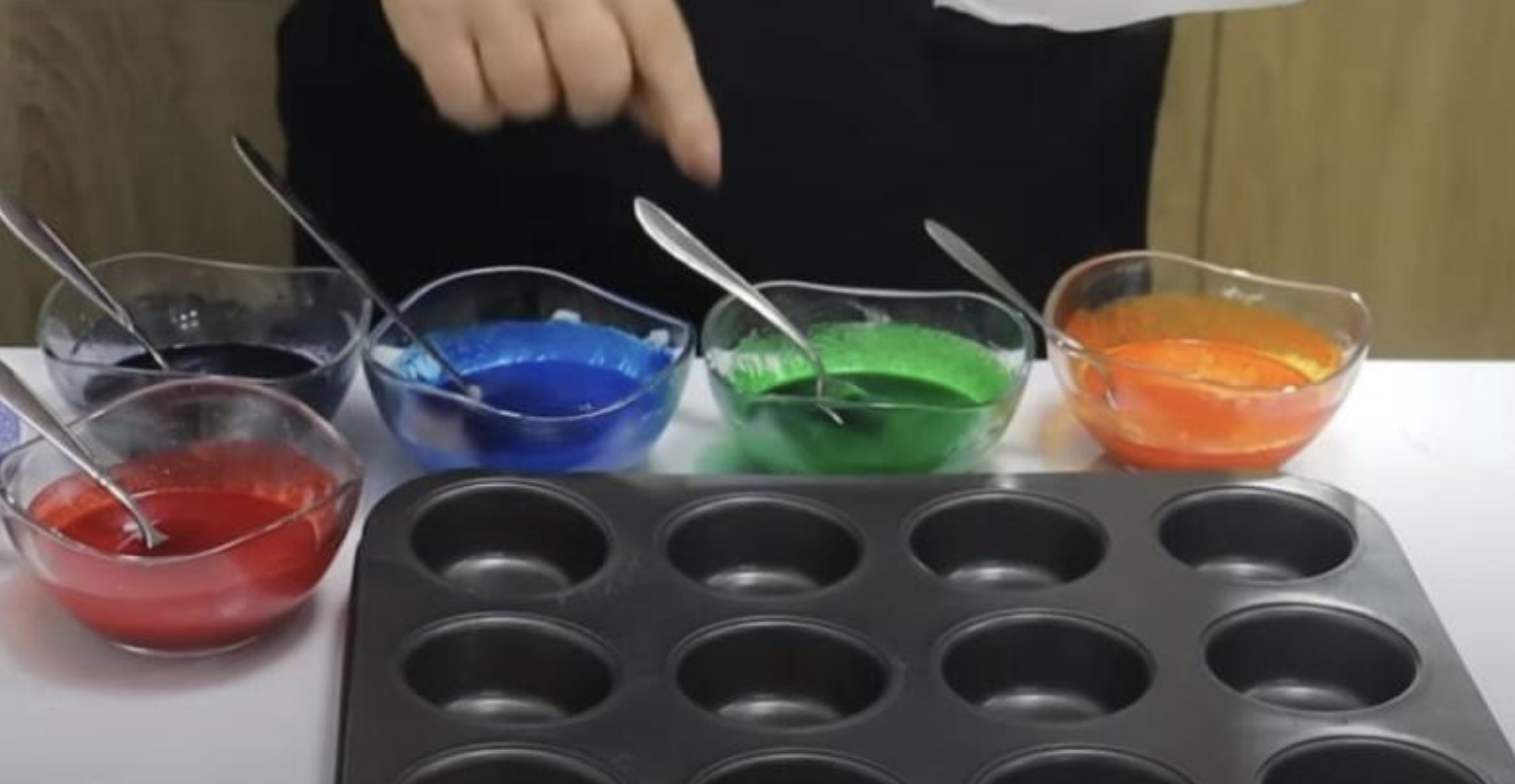- Капнете във всяка по няколко капки течна багра за яйца в разнообразни цветове.