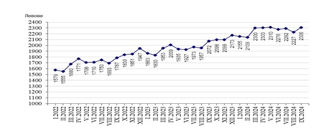 Средната брутна месечна за юли 2024 година е 2 292 лева, за август - 2 227 лева, и за септември - 2 306 лв., сочат данните на Националния статистически институт.