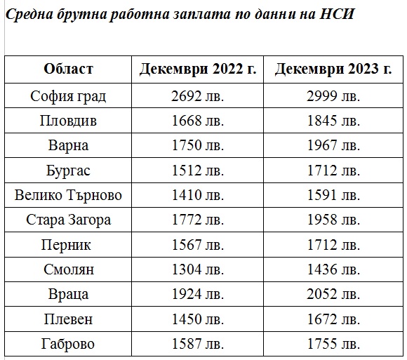 Средната брутна заплата в София е достигнала 2999 лева през декември 2023 година, заяви Националният статистически институт (НСИ). Средното за страната заплащане пък е 2173 лева