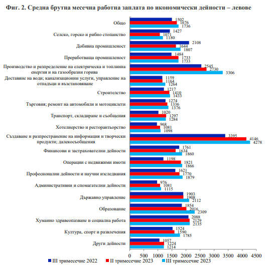 Най-високо средномесечно трудово заплащане през трето тримесечие на 2023 година са получили наетите лица по трудово и служебно правно отношение в икономическите действия: „ Създаване и разпространяване на информация и креативен продукти; далекосъобщения “ - 4 278 лева, „ Производство и систематизиране на електрическа и топлинна сила и на газообразни горива “ - 3 306 лева и „ Образование “ - 2 309 лв.. Най-ниско платени са били наетите лица в икономическите действия: „ Хотелиерство и ресторантьорство “ - 1 098 лева, в „ Административни и спомагателни действия “ - 1 115 лева и „ Селско, горско и рибно стопанство “ - 1 180 лв..