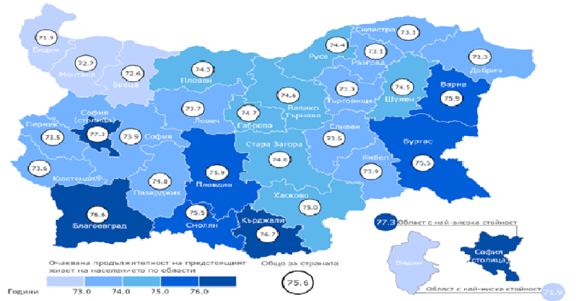 Очакваната дълготрайност на живота варира от 71.9 години в област Видин до 77.3 години в област София (столица).