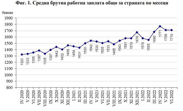 През второто тримесечие на 2022 година междинната месечна работна заплата нараства с 13.4% по отношение на второто тримесечие на 2021 година, като най-голямо e нарастването в икономическите действия „ Административни и спомагателни действия “ - с 21.0%, „ Други действия “ - с 19.0%, и „ Търговия; ремонт на коли и мотоциклети “ - с 18.0%.