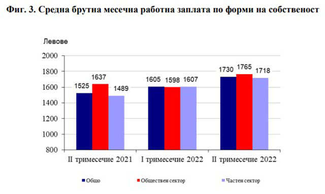 Спрямо същия интервал на миналата година междинната месечна работна заплата през второто тримесечие на 2022 година в публичния бранш нараства със 7.8%, а в частния - с 15.4%.