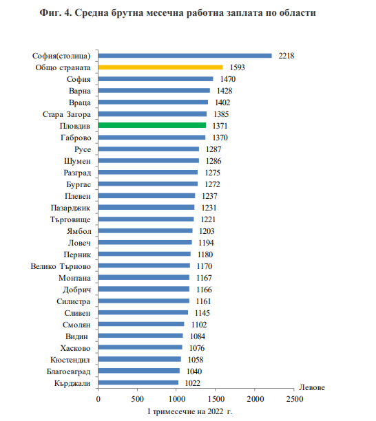 Столичани са тези, които взимат най-висока заплата. В Софийско взимат приблизително 2 218 лева. За сметка на това най-ниско е заплащането в област Кърджали – 1 022 лева За следения интервал междинната работна заплата за страната е 1 593 лева - с 222 лева или 16.2% по-висока от тази за област Пловдив.