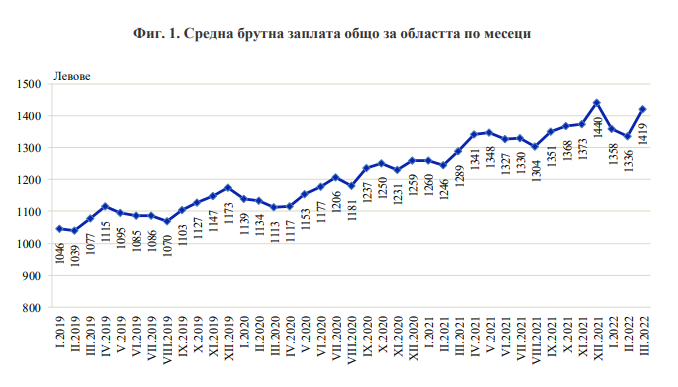 Средната брутна месечна работна заплата в област Пловдив за януари 2022 година е регистрирана на 1 358 лева През февруари тя е била 1 336 лева, а през март - 1 419 лв.. За съпоставяне през първото тримесечие на 2022 година заплатата на пловдивчанина е намаляла по отношение на четвъртото тримесечие на 2021 година с 1.6%, като доближава 1 371 лв..