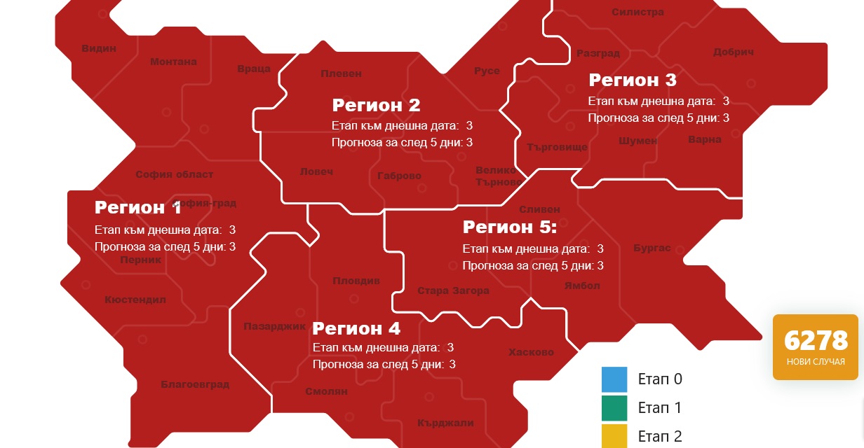 Все още обаче всички области са в тъмночервена зона със заболеваемост над 500 на 100 000 души. Според картата на страната по новия пандемичен проект, всичките пет района са в Етап 3.
