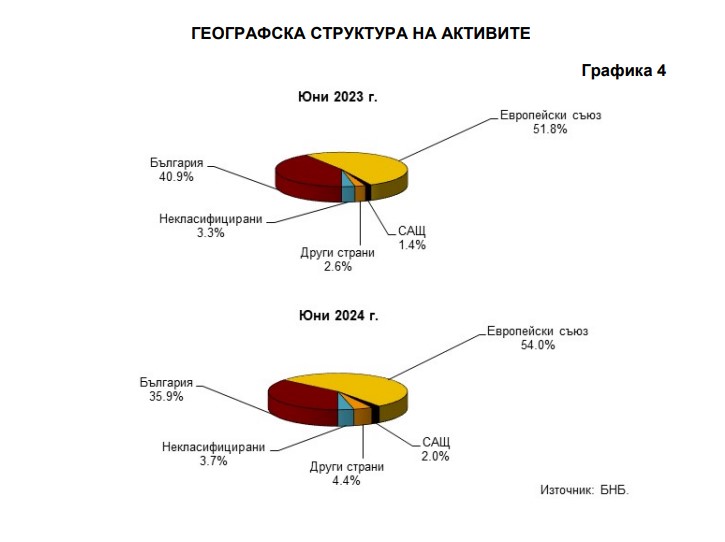 Средствата, вложени в останалите страни от Европейския съюз, нарастват на годишна база с 553.2 млн. лева (10.5%) до 5.837 милиарда лева при 5.284 милиарда лева към края на юни 2023 година Относителният им дял към края на юни 2024 година е 54% при 51.8% в края на юни 2023 г.