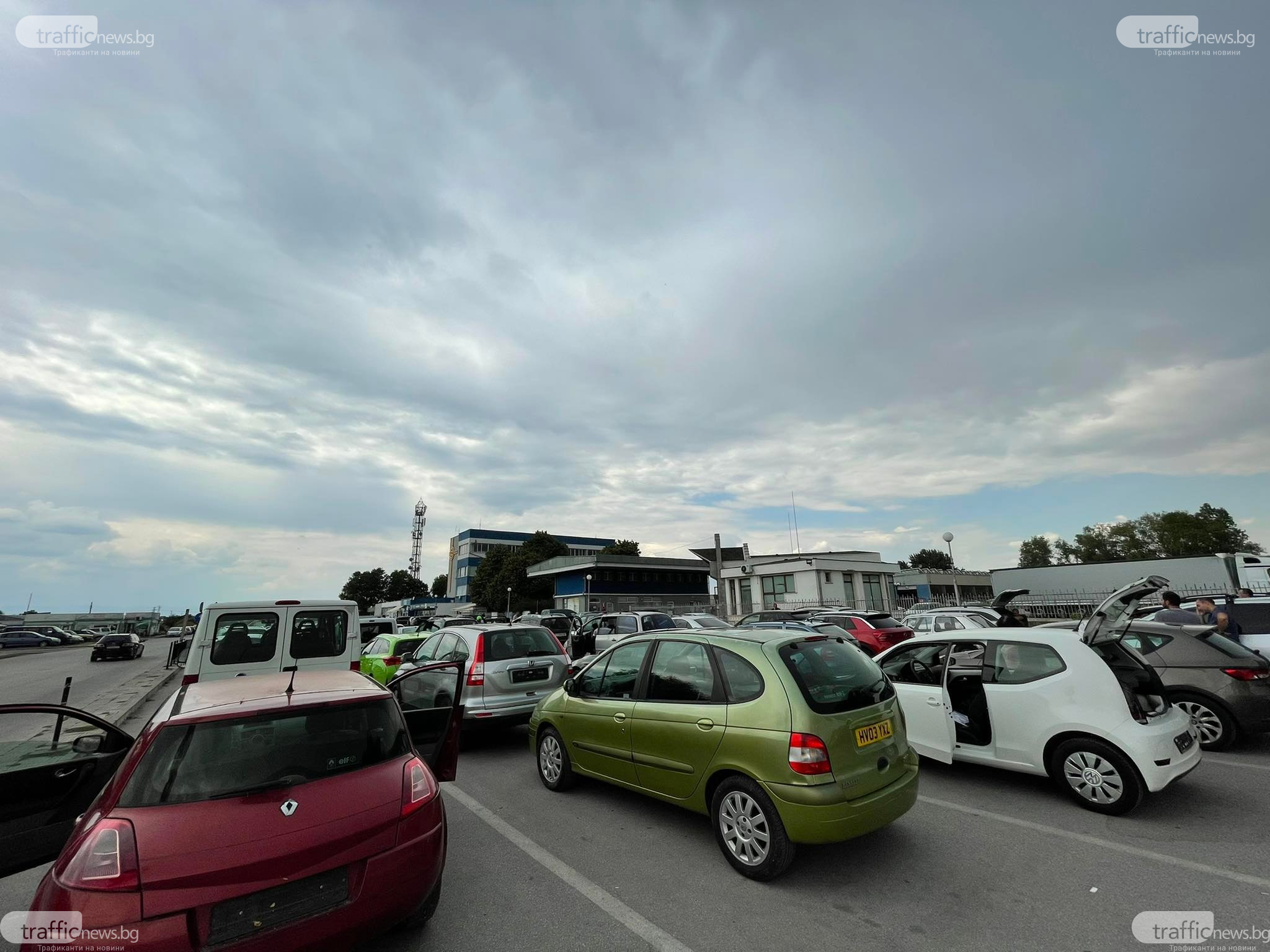 Собственици на десетки МПС-та чакат за регистрация с документи в ръка. Автомобили със свалени или директни номера са паркирани на паркинга.