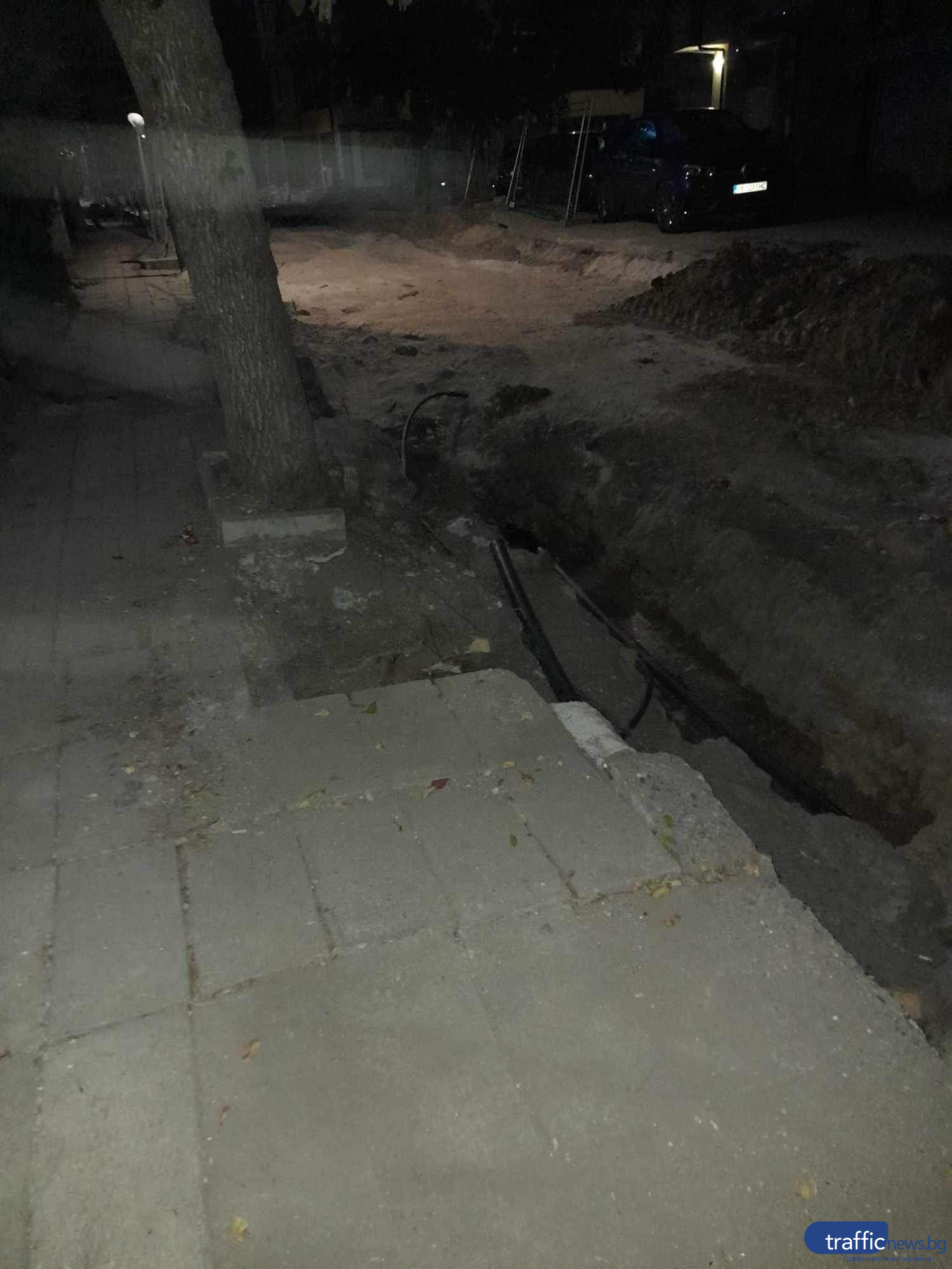Освен че работата по плана е спряна, само че и на мястото има необезопасени дупки по тротоара, които са причина за произшествия. Припомняме, че преди три дни автомобил пък пропадна в една от необезопасените шахти, а преди него и жена. Деца също били на косъм от случай.