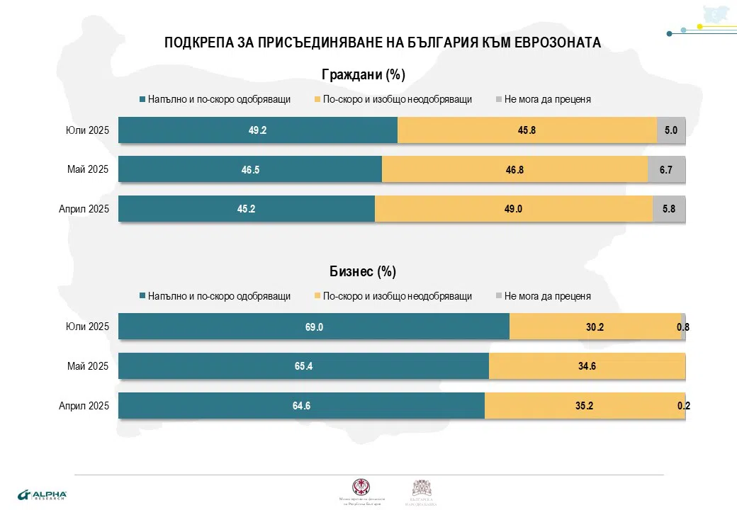 Стабилизиране на поддръжката за присъединение на България към еврозоната регистрират данните от третото " Присъединяване на България към еврозоната ", проследяващо трендовете при настройките на жителите и бизнеса в България по тематиката към този юли.