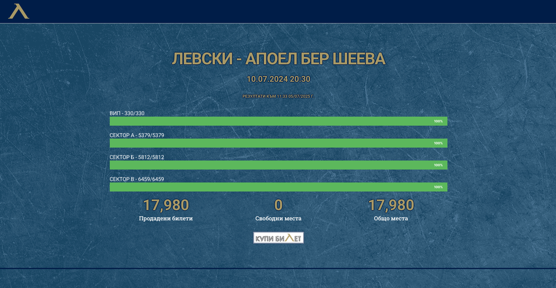 Стадион “Георги Аспарухов ” ще бъде напълнен до краен лимит за срещата сред Левски и Апоел (Беер Шева) от първия прелиминарен кръг на Лига Европа. Днес в 10:00 часа “сините ” пуснаха в свободна продажба билети и по-късно повече от час към този момент всички места бяха разпродадени.