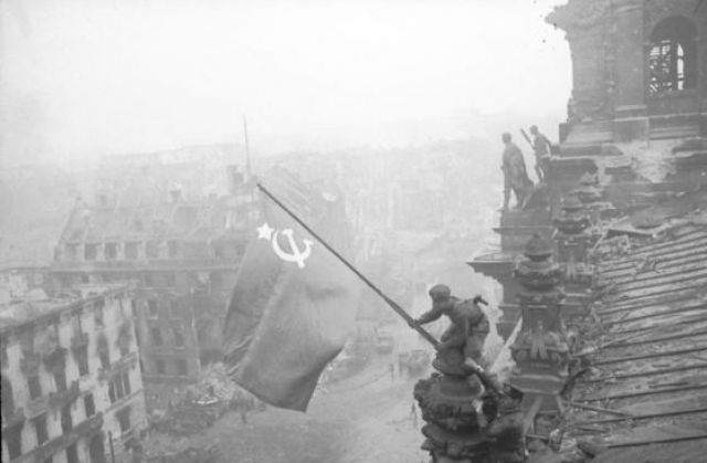 Известната фотография на руските бойци над Райхстага по време на борбата за Берлин, за която по-късно се оказва, че е инсценирана и изменена.