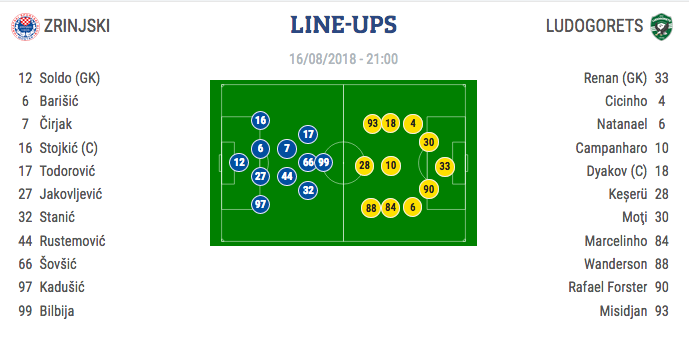 ЗРИНСКИ (4-2-3-1) : 12. Солдо, 97. Кадишич, 27. Яковлевич, 6. Баришич, 16. Стойкич, 7. Циряк, 44. Рустемович, 17. Тодорович, 66. Совшич, 32. Станич, 99. Билбия