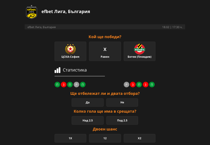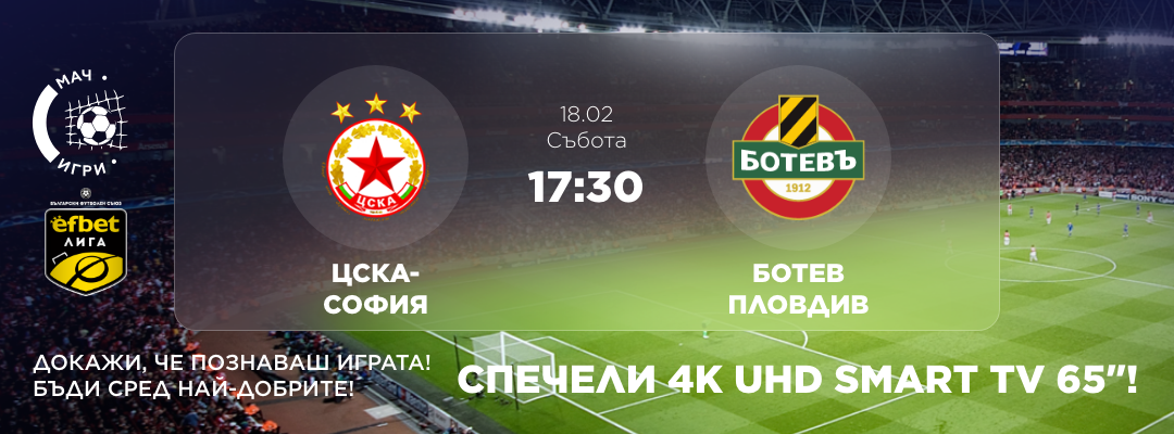 А в случай че подкрепяте ЦСКА - София или Ботев (Пловдив), тази седмица ви предоставяме опция да участвате в нашата " Мач игра " за дуела сред " алените " от София и пловдивските " канарчета ".