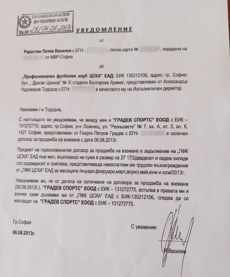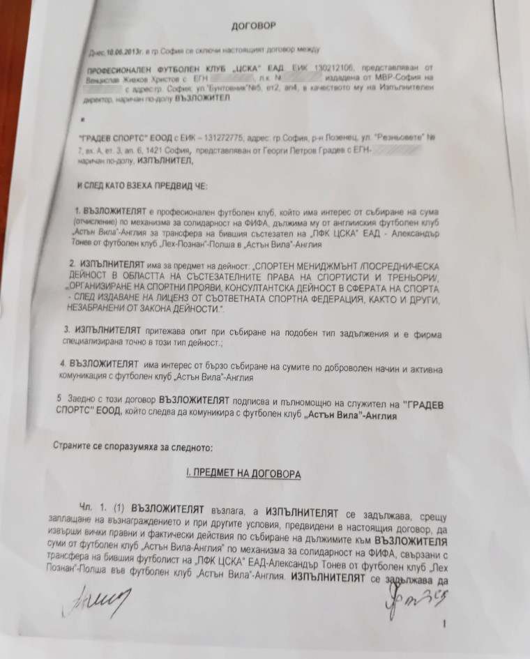Неясно за какво, вместо да напише мейл до Астън Вила, тогавашният изпълнителен шеф на ЦСКА Венцислав Живков подписва контракт с компанията на Георги Градев да събере вземането от британския клуб.