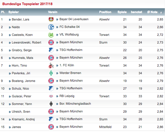 В класацията на Kicker пък над всички е Ларс Бендер от Байер (Леверкузен), като неговата оценка е по-добра от тези поредно на Налдо (Шалке 04), Коен Кастеелс (Волфсбург), Роберт Левандовски (Байерн), Серж Гнабри (Хофенхайм), Матс Хумелс (Байерн), Тимо Хорн (Кьолн), Иржи Павленка (Вердер), Жером Боатенг (Байерн), Нико Шулц (Хофенхайм) и други