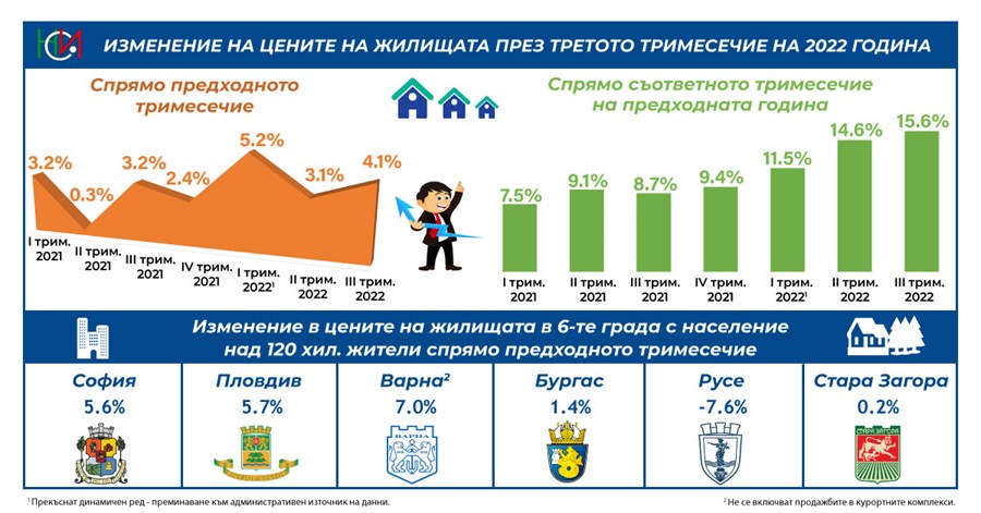 През трето тримесечие на 2022 година цените на жилищата в страната са се нараснали с 4.1% по отношение на предходното тримесечие и с 15.6 % по отношение на същото тримесечие на 2021 година. Спрямо предходното тримесечие най-голямо нарастване е записано в град Варна (+7.0%), следван от градовете Пловдив и София – надлежно с (+5,7%) и (+5,6%), а намаляване на цените се следи в градРусе (-7.6%).
