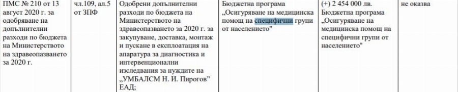В нея се сочи, че с решение от 13 август м.г. на Министерския съвет (МС) са утвърдени спомагателни разноски на стойност 2 454 000 лева по бюджета на Министерството на здравеопазването за 2020 година за " закупуване, доставка, монтаж и стартиране в употреба на инсталация за диагностика и интервенционални проучвания за потребностите на „ УМБАЛСМ Н. И. Пирогов ” ЕАД ".