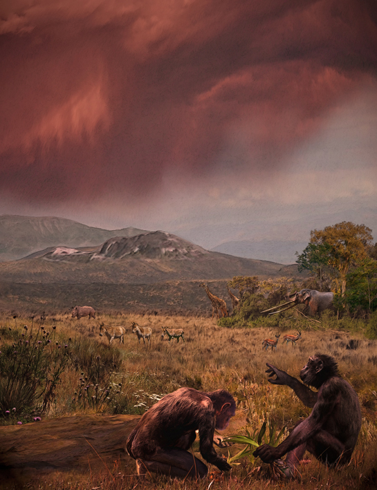 Грекопитекът (Graecopithecus freybergi) е живял преди 7,2 млн. год. в саванни условия. Вляво - аспект на палеосредата, в която е живял, съгласно мястото на намиране на долната челюст (Пиргос Василисис край Атина). В далечината се виждат и през днешния ден съществуващите възвишения Химетос и Ликабетос. Представени са саванните типове животни, открити съгласно откритите фосили. Възстановка на Велизар Симеоновски (Чикагски музей по естествена история) под научното управление на проф. Николай Спасов и проф. Мадлен Бьоме.
