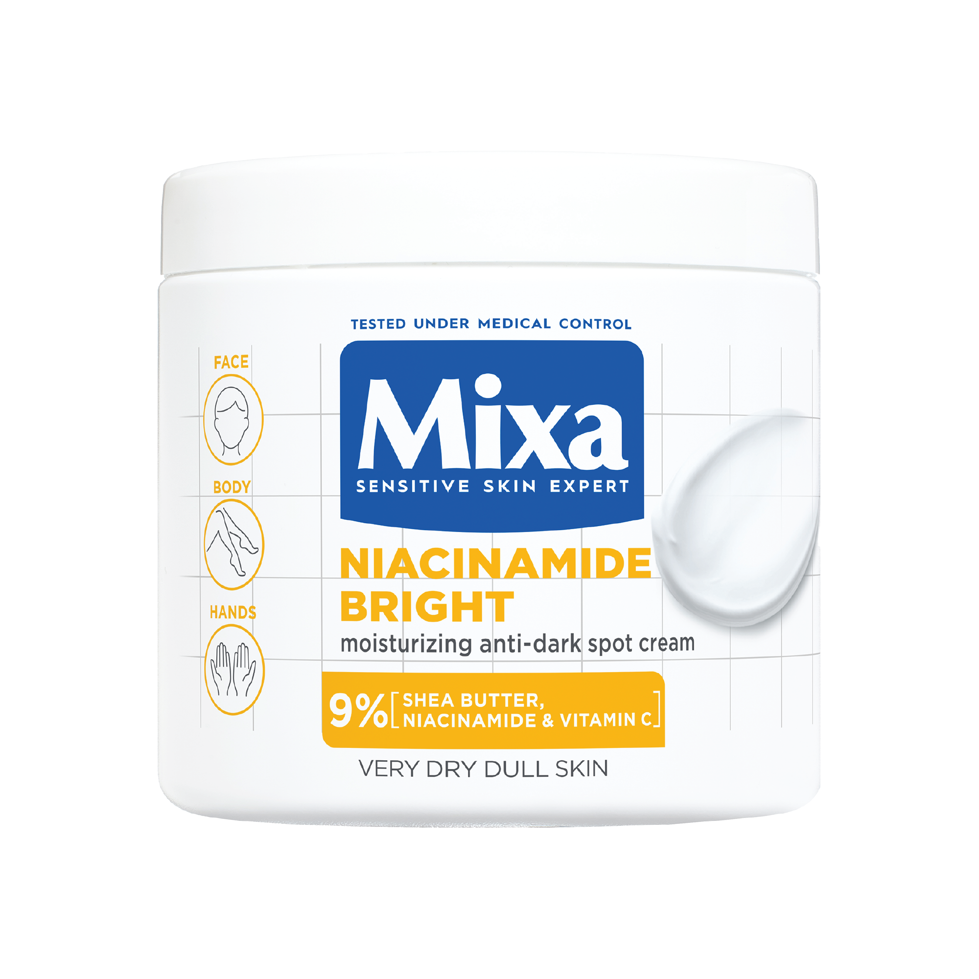 MIXA Niacinamide Bright е особено създаден за суха и сензитивна кожа (каквато става съвсем всяка кожа при прекалено излагане на слънце) - тестван е под медицински надзор и е обогатен с масло от ший, което хидратира и надълбоко подхранва. Предлага се в огромна опаковка от 400 мл, а формулата му е подобаваща за ежедневна приложимост. Може да заеме централно място в шкафа ви с козметика и в ритуала ви за грижа за кожата както на лицето, по този начин и на тялото. Тъй като е лек и попива бързо, не оставя петна по облеклата. Клинично потвърдено понижава интензивността на цвета на тъмните петна при всички тонове на кожата и обезпечава 48-часова хидратация**.