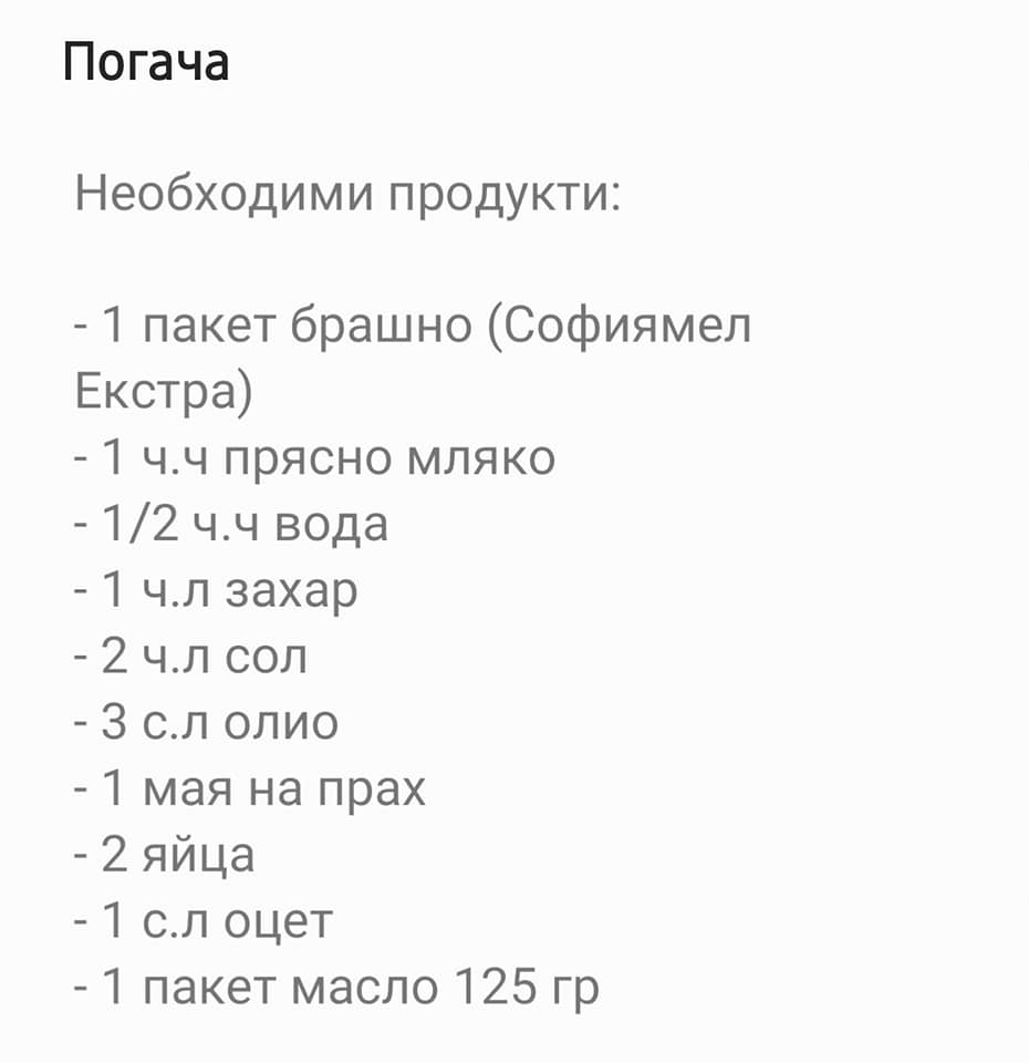 П.С. Добавям метода, по който я върша аз: Водата и млякото се затоплят, прибавя се маята и захарта, 1-2 лъжици брашно и се оставя за 15 мин да се задейства маята. После прибавям оцета, солта, яйцата (1 цяло и 1 белтък, заделям си жълтъка за намазване) и олиото.