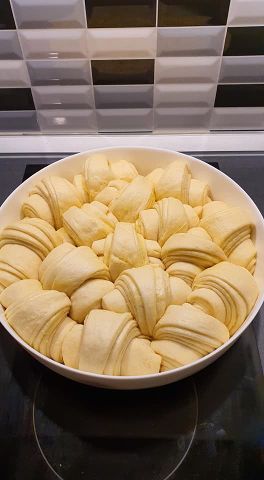 Пресявам брашното и върша бунар, прибавям течните съставки и забърквам тестото. Втасва за час, след това деля на 3 и наточвам 3 кръгли блата, намазвам с масло и класифицирам един върху различен. Разрязвам на 4, след това всяка четвъртина на още 3 и намотавам на кроасанчета. Нареждам в тавата, оставям да втаса още 40 мин, мажа с жълтък и пека. Може да поръсите и сусам по желание.