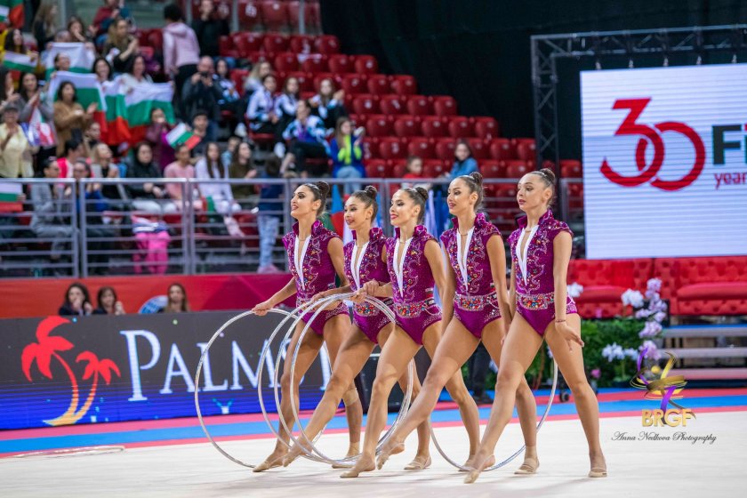 Ансабълът ни (Женина Трашлиева, София Иванова, Камелия Петрова, Рейчъл Стоянов и Радина Томова) още веднъж не взе орден и след шестото място в многобоя остана 5-и във финала с 5 обръча с оценка 32.350. Първото място е за ансамбъла на Израел с 34.950, среброто е за Китай (34.650), а бронзът - за ансамбъла на Украйна (33.350).