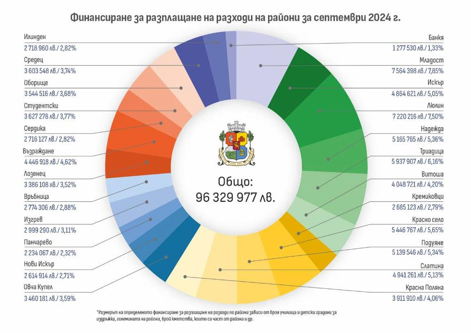 През септември 2024 г. извършените разплащания от общината са 101.1 млн. лева, заредените предели за финансиране на разплащанията на разноските на районните администрации – 96.3 млн. лева лева. и към второстепенни и третостепенни разпределители със средства – 22.1 млн. лева.