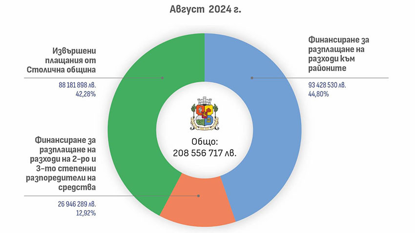 Извършените разплащания от общината през август 2024 година са в размер на 88,1 млн. лева, заредила е лимита за финансиране на разплащанията на разноските на районните администрации – 93.4 млн. лева лева. и към второстепенни и третостепенни разпределители със средства – 26.9 млн. лева