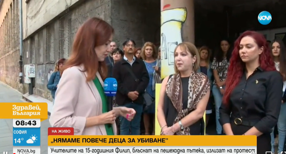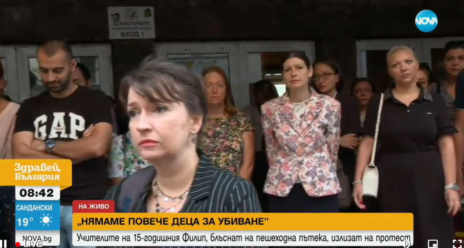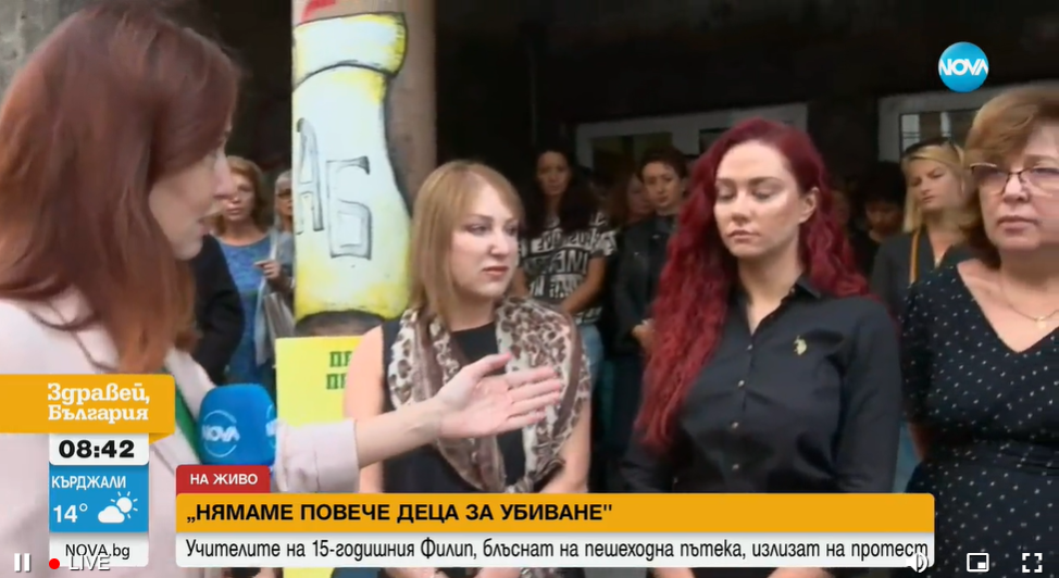 Този поход през днешния ден е, тъй като цялото общество губи, освен ние губим, млади прелестни хора. България губи прелестни младежи и нашата акция е под наслов „ Пресичам вярно, не ме убивайте “, тъй като ние като учители и цялото общество въобще би трябвало да се грижим всекидневно, и да се самовъзпитаваме, и да съблюдаваме разпоредбите, съобщи за Нова Тв шефът на 32-ро учебно заведение Нели Костова.