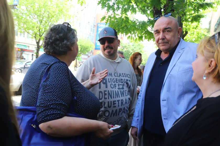 Цялата натрупа на Младежкия спектакъл участва на митинга отпред с шефа Михаил Байков и доайена Стефан Мавродиев.